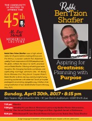 8:15 pm: 45th Annual M. Leo Storch Memorial Lecture by Rabbi Ben Tzion Shafier